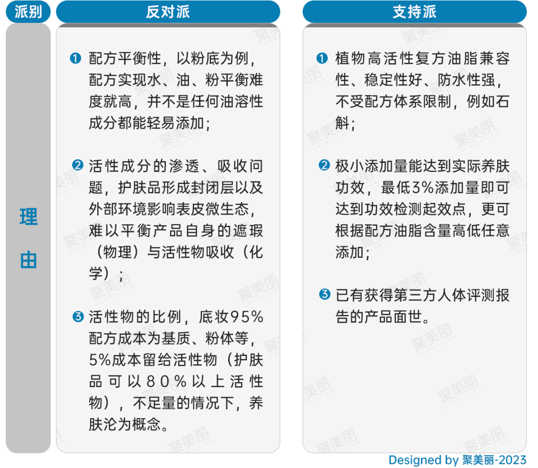 反對派的具體聲音,可以搜索參看美妝科普博主-真魅博客早在2020年就發(fā)表的文章《靠養(yǎng)膚粉底養(yǎng)膚?這又是個(gè)忽悠?》(表格中觀點(diǎn)還參考了最新供應(yīng)鏈方和品牌方意見)。支持派中,方里認(rèn)為底妝的類護(hù)膚心智可以走功效路徑,因?yàn)橄M(fèi)者對于自身的皮膚健康愈加關(guān)注,方里今年也宣布了其中美實(shí)驗(yàn)室和投資方貝泰妮集團(tuán)的研究所進(jìn)行戰(zhàn)略合作,開發(fā)敏感肌方向的底妝產(chǎn)品;而供應(yīng)鏈的代表太和生技孵化器負(fù)責(zé)人郭瑜透露,太和生技已經(jīng)在跟客戶推廣一款擁有祛痘功效人體評測報(bào)告的粉底液。