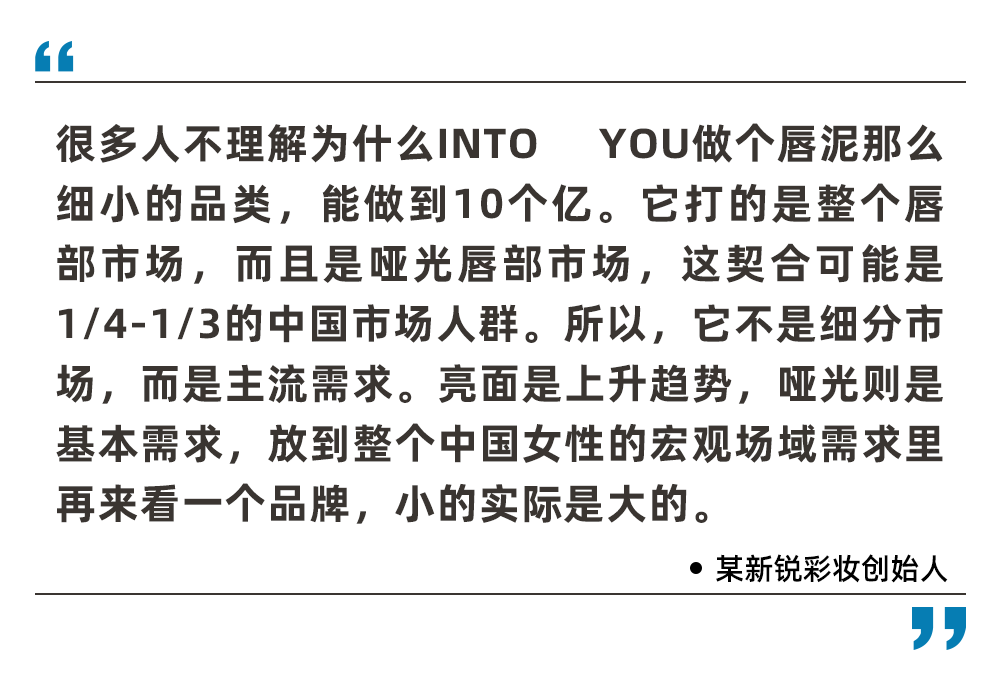 02)質(zhì)地,雖然有其他小眾顏色出現(xiàn),但畢竟紅色是中國市場的最大基本盤,而顏色總有盡時(shí),所以近幾年的競爭邏輯轉(zhuǎn)到了質(zhì)地,這個(gè)也有一個(gè)輪回。比如前幾年消費(fèi)者更多追求啞光的質(zhì)地,體現(xiàn)出更自然的妝感,INTO YOU在唇泥這一質(zhì)地的創(chuàng)新吃到了這一波最大的紅利;如今趨勢如輪回般來到了亮面的需求側(cè),而通過配方和制作工藝的創(chuàng)新,將亮面質(zhì)地在口紅上做到極致的酵色,成功拿下了大量唇部亮面質(zhì)地的市場。