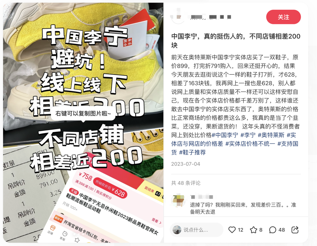 在小紅書等社交媒體上,有不少網(wǎng)友吐槽稱,在奧特萊斯中國李寧實(shí)體店買到的折扣鞋,比在網(wǎng)上以及其他線下門店的價(jià)格貴出200元?!艾F(xiàn)在各個(gè)實(shí)體店價(jià)格都千差萬別了,這樣誰還敢去中國李寧的實(shí)體店買東西。”