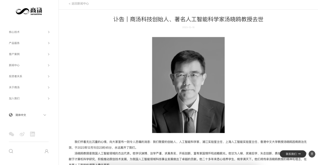 12月16日,商湯科技(0020.HK)發(fā)布訃告:我們敬愛的創(chuàng)始人、人工智能科學(xué)家、浦江實(shí)驗(yàn)室主任、上海人工智能實(shí)驗(yàn)室主任、香港中文大學(xué)教授湯曉鷗因病救治無效,于2023年12月15日23時(shí)45分,永遠(yuǎn)離開了我們。
