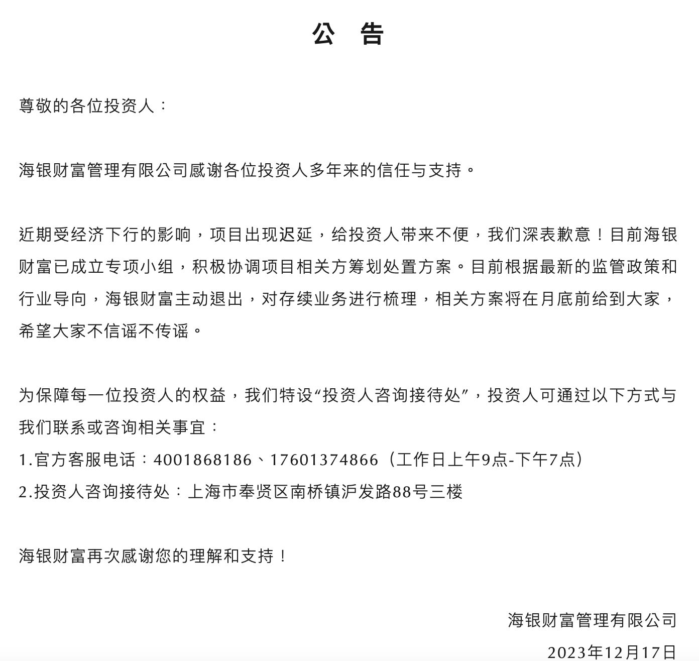 12月17日,海銀財富官微發(fā)布公告顯示:近期受經濟下行的影響,項目出現(xiàn)遲延,給投資人帶來不便,深表歉意!目前海銀財富已成立專項小組,積極協(xié)調項目相關方籌劃處置方案。目前根據(jù)最新的監(jiān)管政策和行業(yè)導向,海銀財富主動退出,對存續(xù)業(yè)務進行梳理,相關方案將在月底前給到大家。