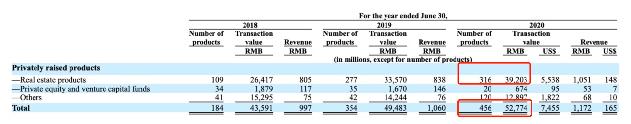 2021年3月海銀財富于美國納斯達克上市,招股說明書稱其為“國內最大的房地產固定收益產品提供商”,且為中國第三大且增長最快的第三方財富管理服務機構。并披露相關數(shù)據(jù),截止2020年6月,私募產品交易額527.74億,其中房地產產品交易額392.03億,占比約74%。產品數(shù)量共456個,其中房地產項目316個,占比約69%。
