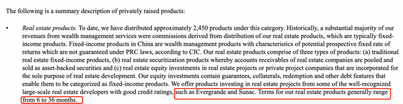 對于以上產品,招股說明書指出海銀提供的產品投資于恒大、融創(chuàng)等知名、信用評級良好的大型開發(fā)商的房地產項目,期限一般為6-36個月。