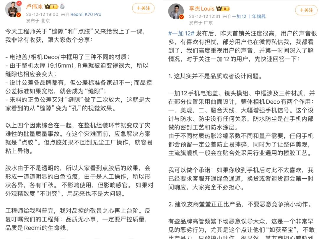 最近一次的針尖對麥芒,是源于小米集團(tuán)總裁盧偉冰的微博。12月11日,盧偉冰表示稱“縫隙”“點(diǎn)膠”事故發(fā)酵愈來愈熱,已經(jīng)有較多購買用戶選擇退機(jī)。雖然他并未指明是誰家的產(chǎn)品,但大家都知道是剛發(fā)布不久的一加12。
