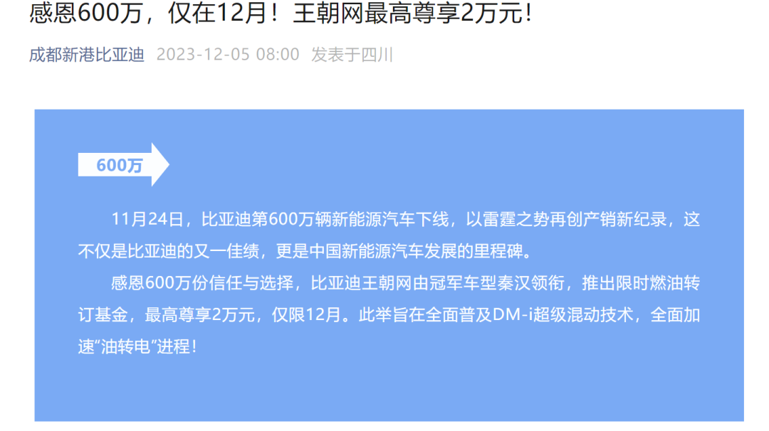 面對(duì)31.66萬輛的月銷量目標(biāo),比亞迪在12月初就以“感恩600萬”(11月24日,比亞迪迎來第600萬輛新能源汽車下線)的名義,針對(duì)旗下王朝網(wǎng)、海洋網(wǎng)部分車型發(fā)布了大規(guī)模的限時(shí)優(yōu)惠政策。