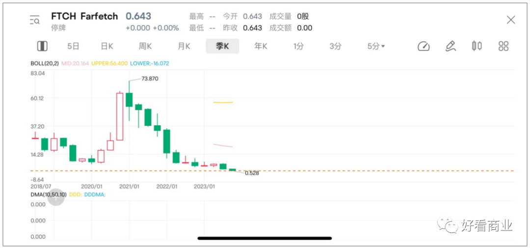 短短3年,F(xiàn)arfetch的命運急轉(zhuǎn)直下,股價較最高點跌掉了99%,260億美元市值灰飛煙滅,幾近歸零。