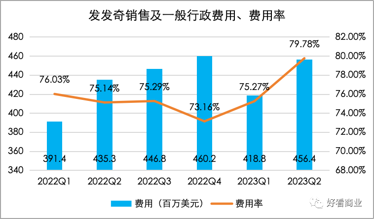 品牌業(yè)務(wù)和線下店的擴張,還增加了Farfetch的運營成本。2022年以來,F(xiàn)arfetch銷售費用和人員規(guī)模都因新業(yè)務(wù)擴張而快速增加,銷售及一般行政費用率保持在75%左右的高位。