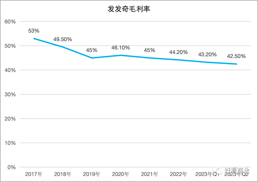 因此,F(xiàn)arfetch近幾年的毛利率一路下滑:從2020年的46.1%降至2022年44.2%。今年Q2時,公司毛利率進一步降至42.5%。而在上市前,公司毛利率通常保持在50%以上。
