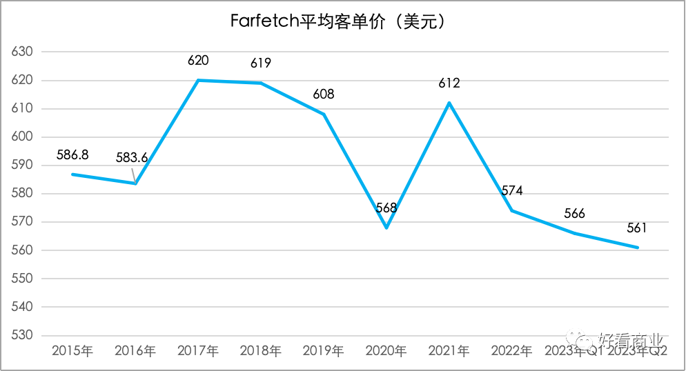 不僅活躍用戶數(shù)增速放緩,用戶在Farfetch花錢也越來越少。Farfetch的平均客單價從2021年的612元一路下滑,到今年Q2時已降至歷史低點——561美元,較2021年降超8%。