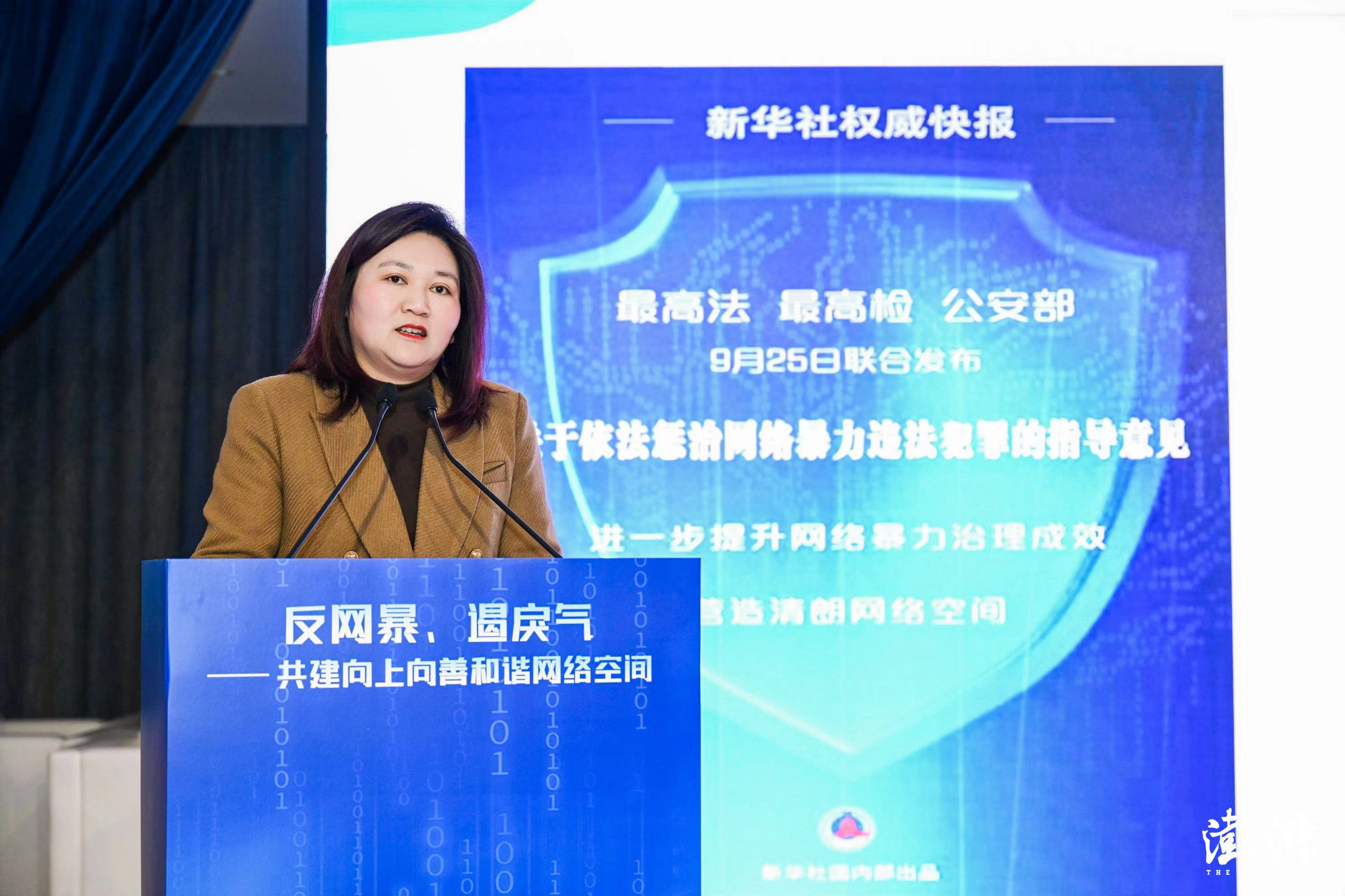 上海市委網(wǎng)信辦副主任俞旻驍作主旨發(fā)言,分享網(wǎng)絡(luò)暴力治理的重點(diǎn),強(qiáng)調(diào)要壓實(shí)網(wǎng)站的主體責(zé)任,在風(fēng)險(xiǎn)預(yù)警、防擴(kuò)散、受害人保護(hù)上有所作為;要發(fā)揮協(xié)同聯(lián)動(dòng)的作用,網(wǎng)信辦與公安、檢察院、法院等部門(mén)一起建立相應(yīng)的網(wǎng)絡(luò)治理協(xié)同聯(lián)動(dòng)機(jī)制;要強(qiáng)化法制保障,堅(jiān)持亮利劍、出重拳;要培育網(wǎng)絡(luò)文明,持續(xù)凈化網(wǎng)絡(luò)生態(tài)空間。