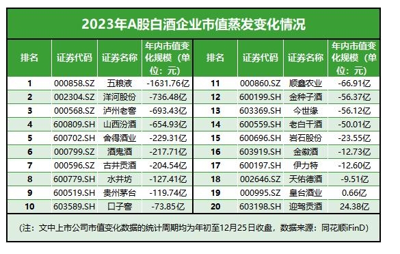 相比前面兩位“幸運(yùn)兒”,大部分白酒企業(yè)沒能于2023年末在資本市場(chǎng)中收獲一份令人喜悅的答卷。這18家白酒上市企業(yè),年內(nèi)合計(jì)蒸發(fā)的市值達(dá)4976.95億元。