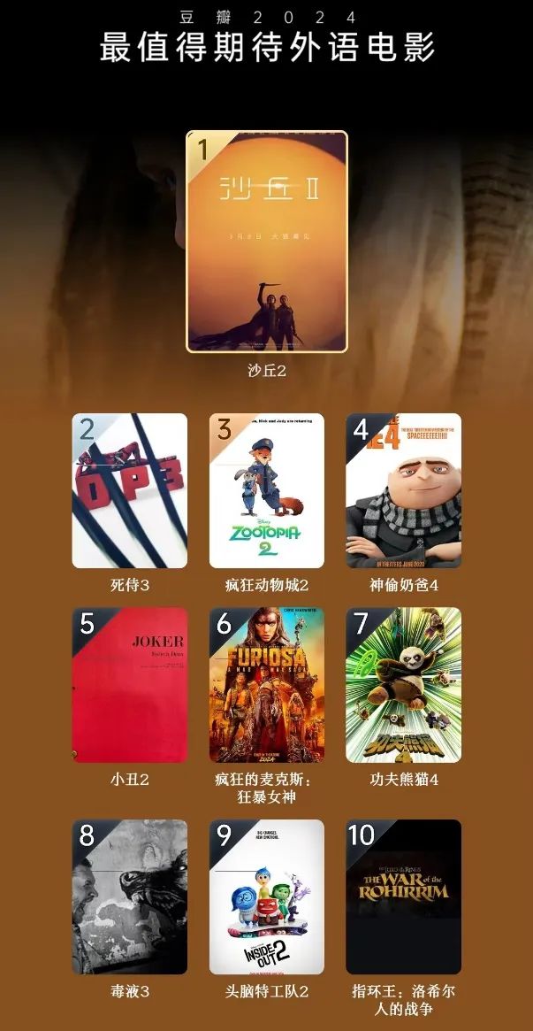 今年豆瓣年度影視榜單中,2024最值得期待的外語電影里竟全部都是IP向續(xù)作。大眾一邊期待著優(yōu)質(zhì)IP的海量內(nèi)容供給,一邊嫌厭著粘貼復制的過時故事。觀眾呼喚的東西一直都只有一個,好的故事與好的電影內(nèi)容。