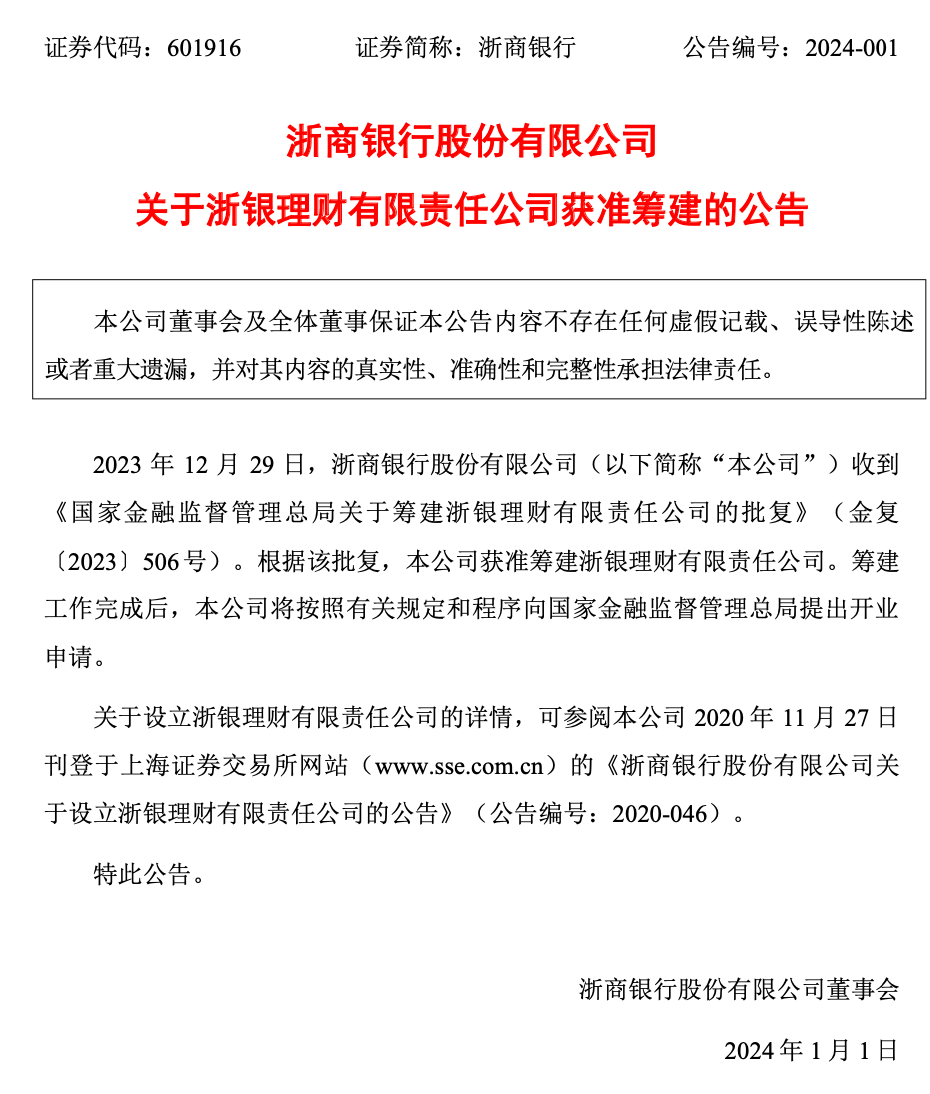 2024年1月1日,浙商銀行(601916.SH)發(fā)布《關(guān)于浙銀理財有限責(zé)任公司獲準(zhǔn)籌建的公告》。