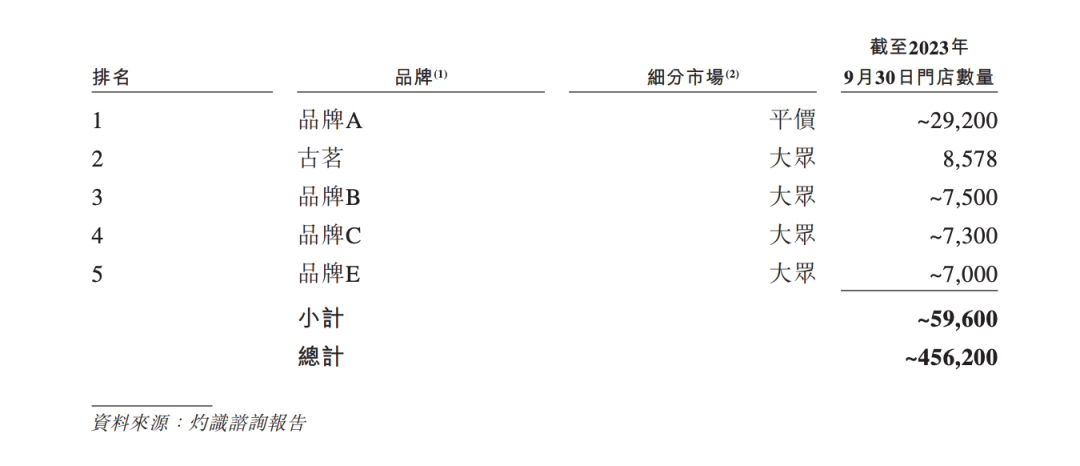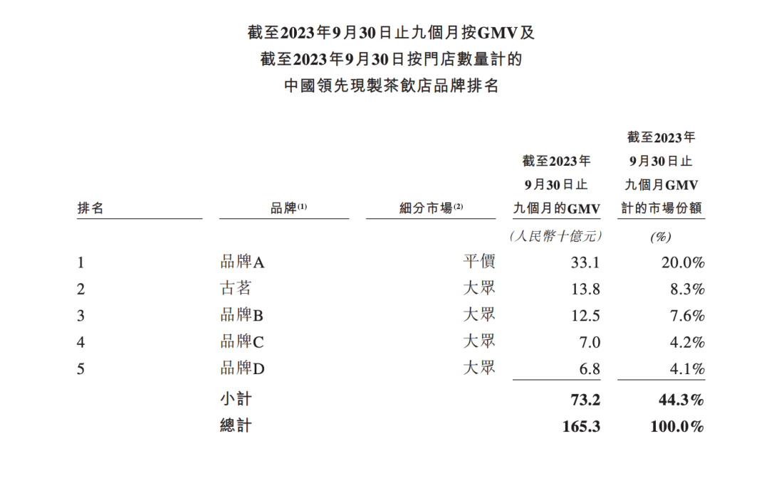 從競(jìng)爭(zhēng)格局來看,中國(guó)現(xiàn)制茶飲店市場(chǎng)歷來分散,但近年來在持續(xù)整合中,前五大品牌市場(chǎng)份額逐步擴(kuò)大。截至2023年9月30日的九個(gè)月,按GMV計(jì)算的前五大品牌占據(jù)了44.3%的市場(chǎng)份額(其中古茗排名第二,擁有8.3%的市場(chǎng)份額)。