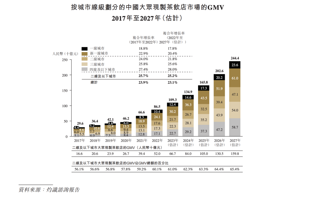 根據(jù)灼識(shí)咨詢報(bào)告,2017年至2022年間,中國(guó)現(xiàn)制茶飲市場(chǎng)的GMV從873億元增長(zhǎng)至2137億元,復(fù)合年增長(zhǎng)率為19.6%,預(yù)計(jì)到2027年將達(dá)到5118億元,復(fù)合年增長(zhǎng)率為19.1%。