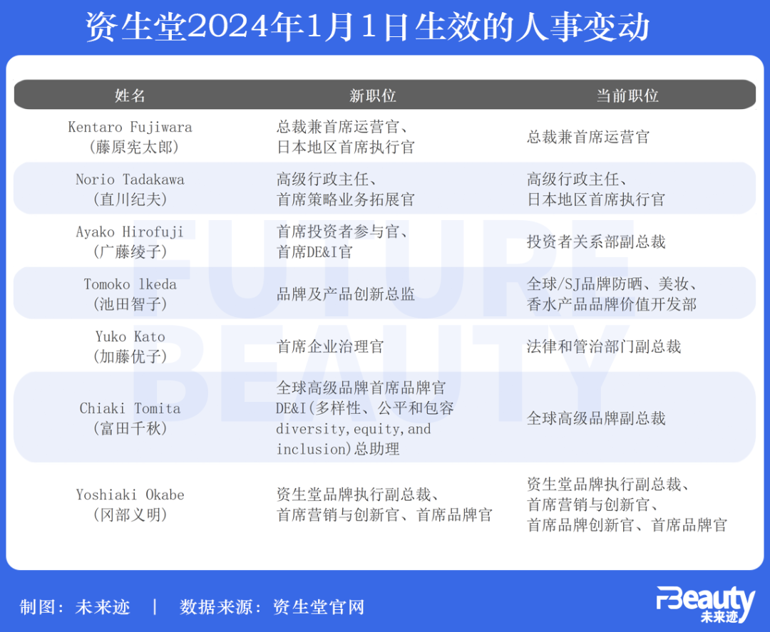 2023年11月,資生堂集團發(fā)布最新人事變動中,包含事關(guān)日本本土市場、投資、營銷和產(chǎn)品開發(fā)等的7項新任命。其中,曾任資生堂中國CEO的藤原憲太郎,繼今年1月1日升任資生堂社長、COO(資生堂集團總裁兼首席運營官)后,明年將在原來職務(wù)基礎(chǔ)上,還擔任日本地區(qū)首席執(zhí)行官一職。