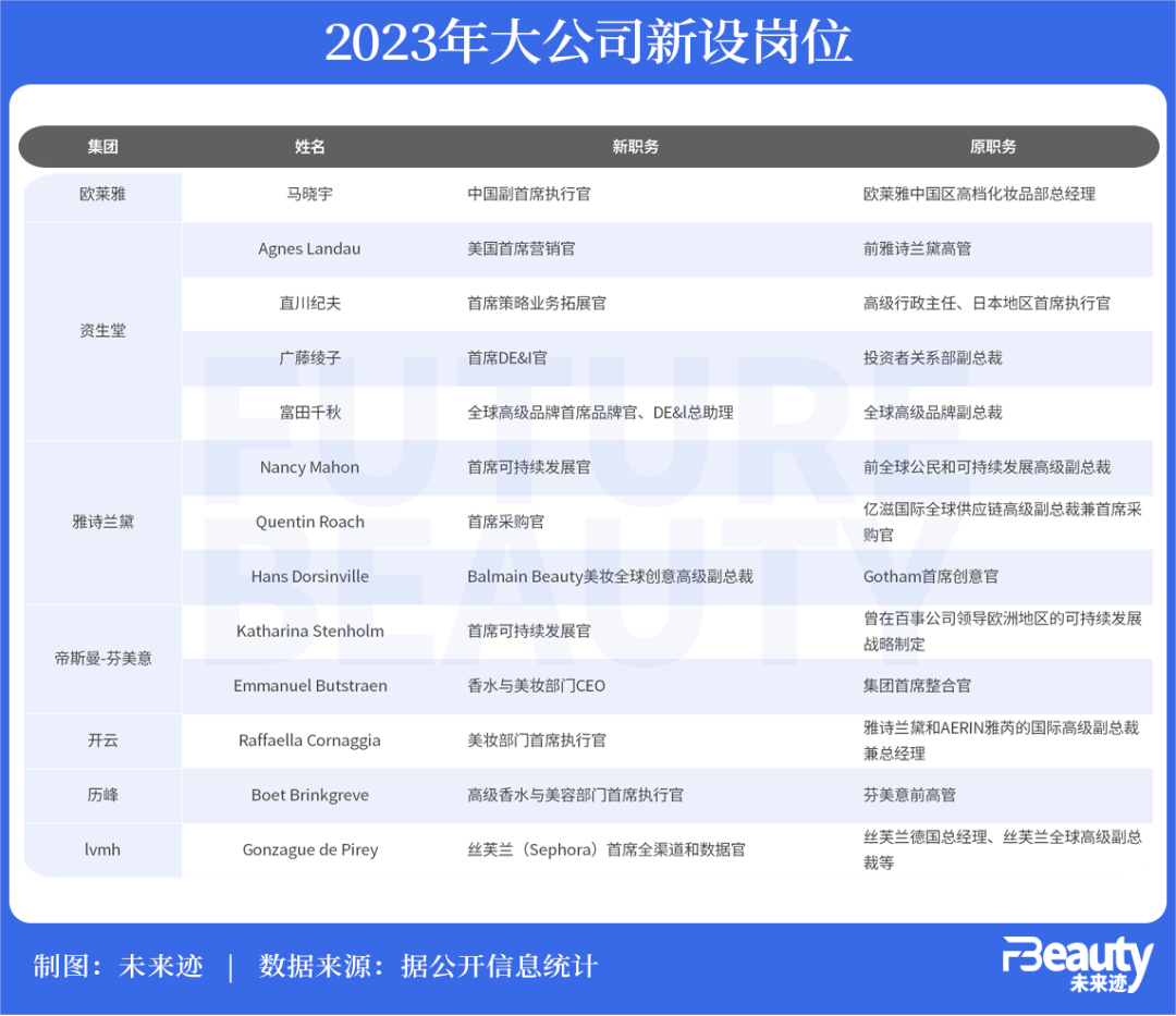 《FBeauty未來跡》統(tǒng)計發(fā)現(xiàn),2023年歐萊雅集團、資生堂、雅詩蘭黛、帝斯曼-芬美意等7家國際公司共設(shè)立了13個新職位。