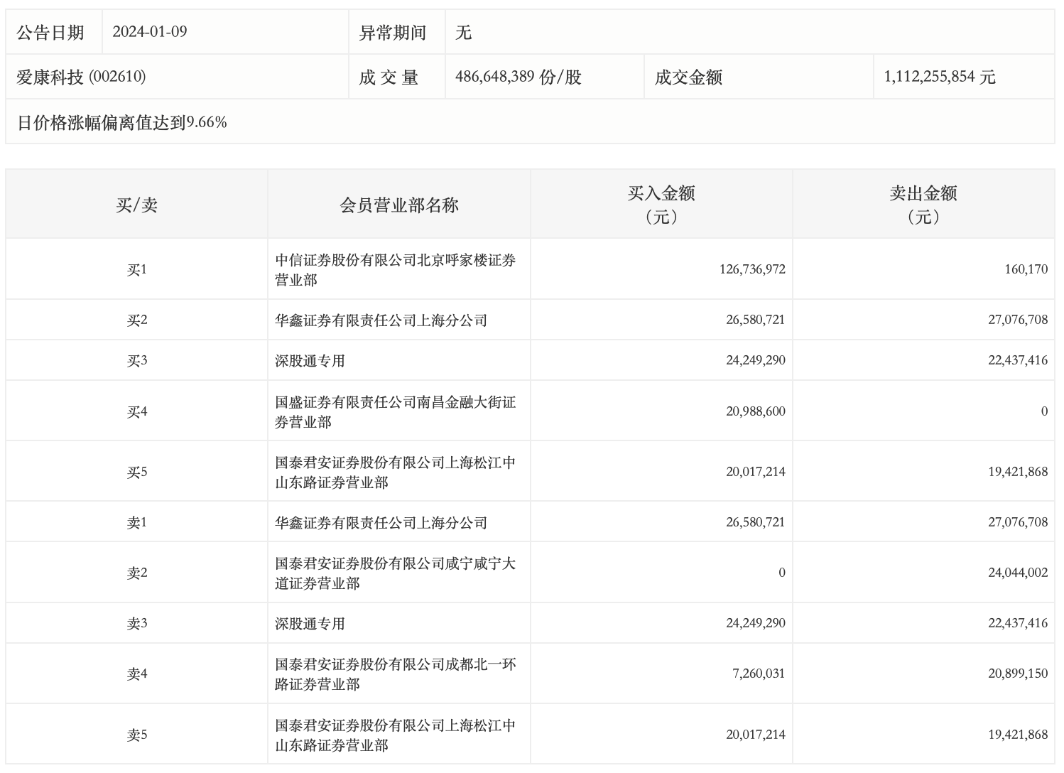 1月9日,愛康科技今日漲停,成交額11.12億元,換手率10.87%,盤后龍虎榜數(shù)據(jù)顯示,中信證券北京呼家樓席位凈買入1.27億元,深股通專用席位買入2424.93萬元并賣出2243.74萬元。