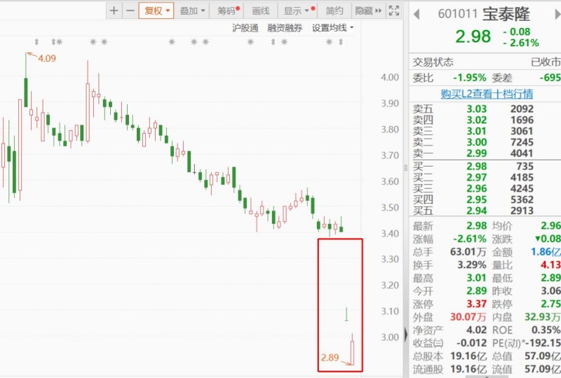 1月15日(周一),寶泰隆股價(jià)跌停,報(bào)收3.06元/股(-10.00%);1月16日股價(jià)以2.89元/股(-5.56%)大幅低開(kāi),全天低位震蕩,最終收于2.98元/股,收跌2.61%。1月17日早盤開(kāi)盤,該股股價(jià)翻紅。