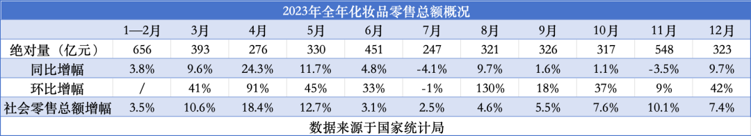 1月17日,國家統(tǒng)計局發(fā)布數(shù)據(jù)顯示,2023年12月,社會消費品零售總額達43550億元,同比增長7.4%;其中,限額以上化妝品類零售總額為323億元,較上月實現(xiàn)了9.7%的增長。
