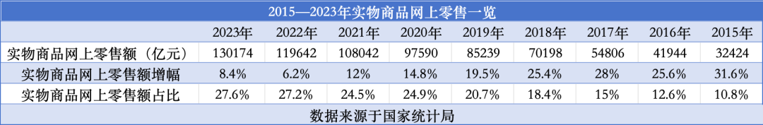 此外,儀美尚還統(tǒng)計了2015—2023年近9年間實物商品網(wǎng)上零售數(shù)據(jù),可以看出,去年,實物商品網(wǎng)上零售額8.4%的增幅,僅略高于2022年6.2%的增幅,而遠低于2015—2021年的增長速度,尤其是與增速最快的2017年相比,2023年較之低了近20個百分點。