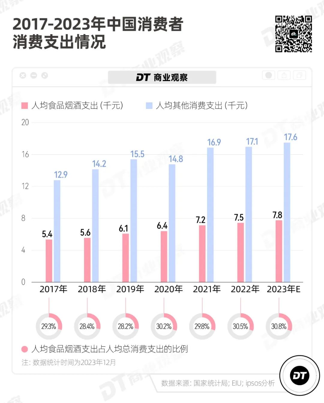 從行業(yè)層面來看,食品飲料作為必需消費品,一直受消費者重視,具備一定程度的抗周期性。過去幾年,人們在食飲上的開支逐年增長,且近三年的占比越來越高。