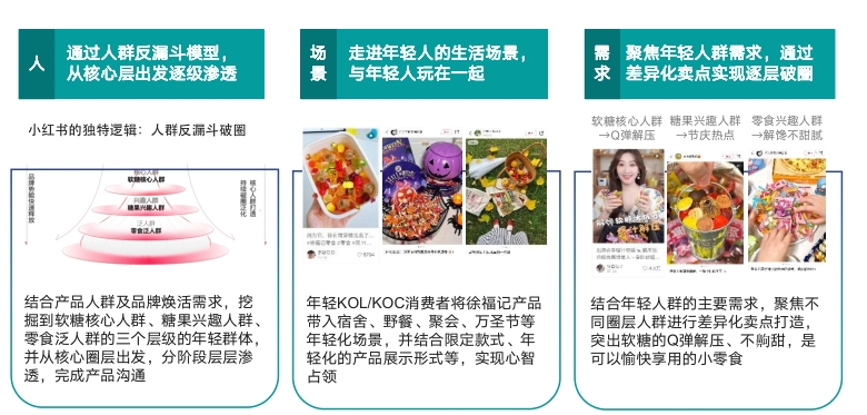 在選定產(chǎn)品后,徐福記利用小紅書特色的“人群反漏斗模型”找到核心溝通人群,并挖掘出年輕人的消費場景,通過打造差異化賣點,去做深耕和進一步拓圈,最后實現(xiàn)在2個月內(nèi)登頂糖果賽道內(nèi)容滲透率第一的成果。