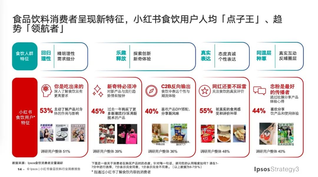 數(shù)據(jù)也顯示,相比較行業(yè)整體,小紅書食飲人群的特征,是更理性、更喜歡探索、態(tài)度更真誠以及更愛分享的一波人。