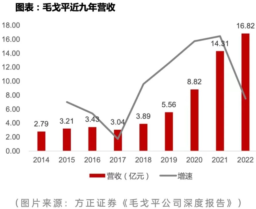但毛戈平先生并不滿足于只做一個杰出的影視化妝師,而是轉(zhuǎn)向生活化妝和普及化妝知識,創(chuàng)辦了毛戈平形象藝術(shù)學(xué)校和美妝品牌毛戈平MAOGEPING。創(chuàng)立以來,毛戈平美妝品牌定位輕奢、高端,主要面向都市女性客群,22年全年,該美妝品牌收入15.72億元,貢獻(xiàn)了毛戈平公司95%的收入來源。