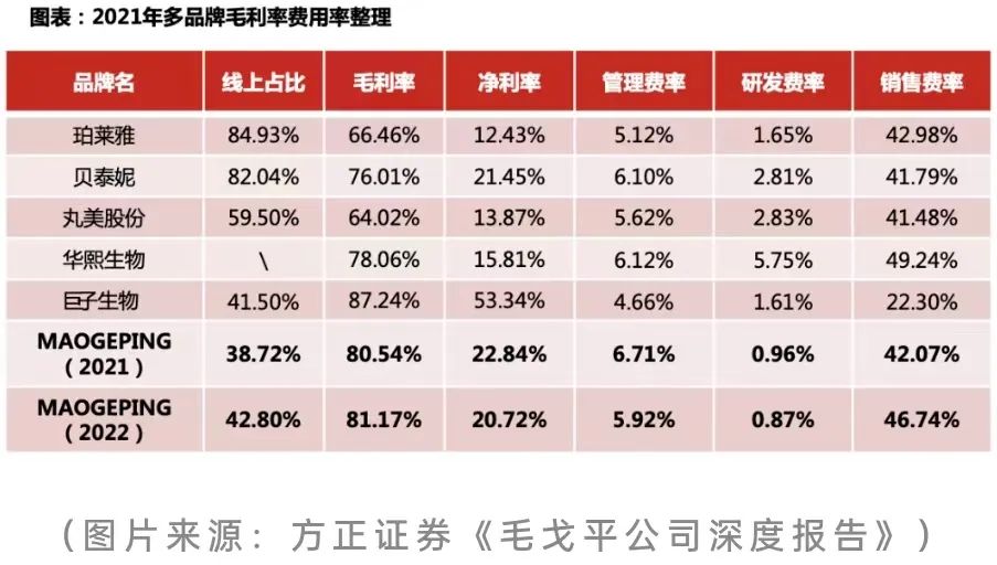消費者對國貨的疑慮不無道理。隨著一些國貨化妝品公司的上市,財務(wù)數(shù)據(jù)的公開加深了不少消費者對國貨化妝品“重營銷、輕研發(fā)”的印象。毛戈平招股書中的財務(wù)數(shù)據(jù)顯示,毛戈平的毛利率高達(dá)80%以上,營銷費率超過40%,而研發(fā)費率不足1%,遠(yuǎn)低于珀萊雅、丸美股份等國內(nèi)同行。一直以來,毛戈平彩妝以“高端、專業(yè)”的形象示人,但超高的毛利率也使消費者心里犯嘀咕:我為了“專業(yè)”花的錢,到底有多專業(yè)?