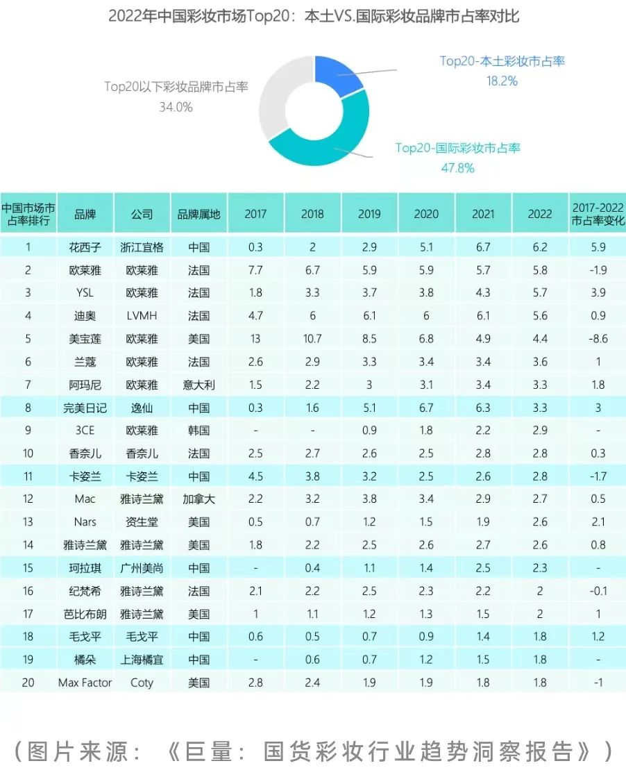 根據(jù)巨量《國貨彩妝行業(yè)趨勢洞察報告》,2022年中國彩妝市場TOP20中,本土品牌僅7個席位,且這7個品牌的總市占率僅18.2%。2023年是不少國貨迎來“潑天的富貴”的一年,但同時也有不少新銳國貨品牌消失,國貨化妝品的出路究竟在哪里?