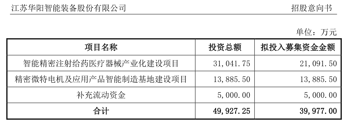此番,華陽智能的計劃融資額也不算高,為3.9977億元,將投入到“智能精密注射給藥醫(yī)療器械產業(yè)化建設項目”2.11億元,“精密微特電機及應用產品智能制造基地建設項目”1.39億元,剩下的5000萬元用于補充流動資金。