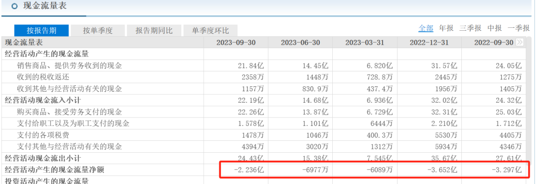 至2023年第三季度為止,7年中共28個單季度財務(wù)數(shù)據(jù)中,只有2018年3個季度、2019年2個季度、2021年2個季度合計7個季度的數(shù)據(jù)為正,其余均為負數(shù),即經(jīng)營活動的支出現(xiàn)金大于流入現(xiàn)金。