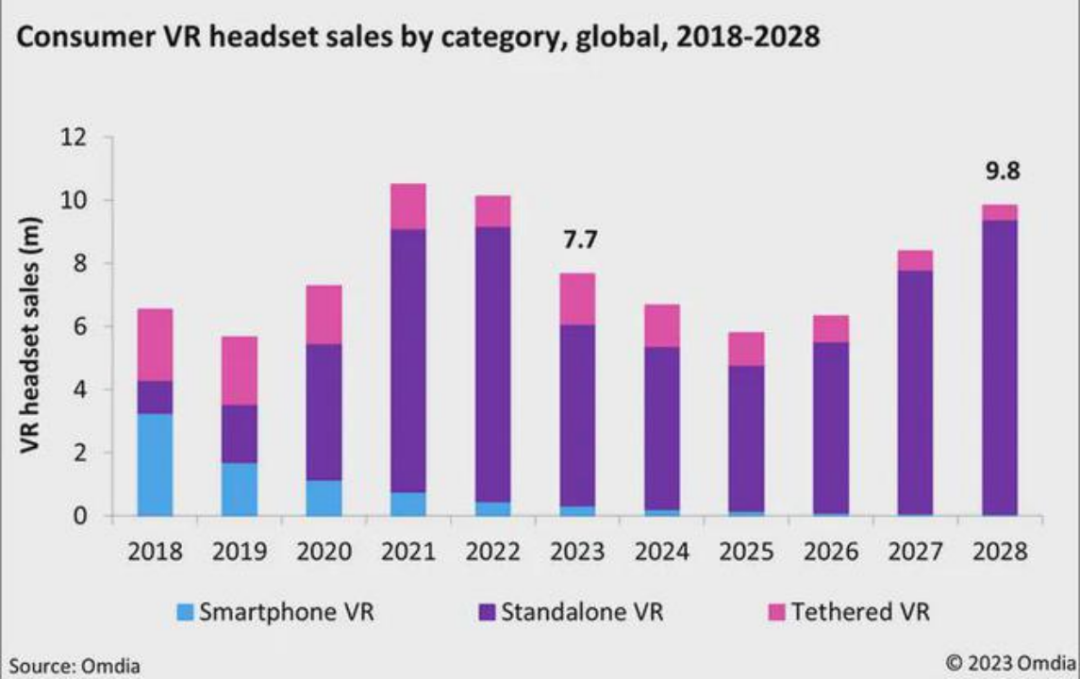 根據(jù)海外市場(chǎng)調(diào)研機(jī)構(gòu)Omdia的研究顯示,2023年消費(fèi)級(jí)VR市場(chǎng)出現(xiàn)嚴(yán)重下滑,頭顯銷量下降24%,從2022年的1010萬部暴跌至770萬部;預(yù)計(jì)2024年和2025年將進(jìn)一步下降13%。