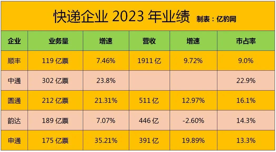 億豹網(wǎng)匯總2023年上市快遞企業(yè)月度報告發(fā)現(xiàn),各家快遞業(yè)務(wù)量全部保持上漲態(tài)勢,申通、中通、圓通超過19.4%的行業(yè)增速,順豐與韻達(dá)增速低于兩位數(shù)。