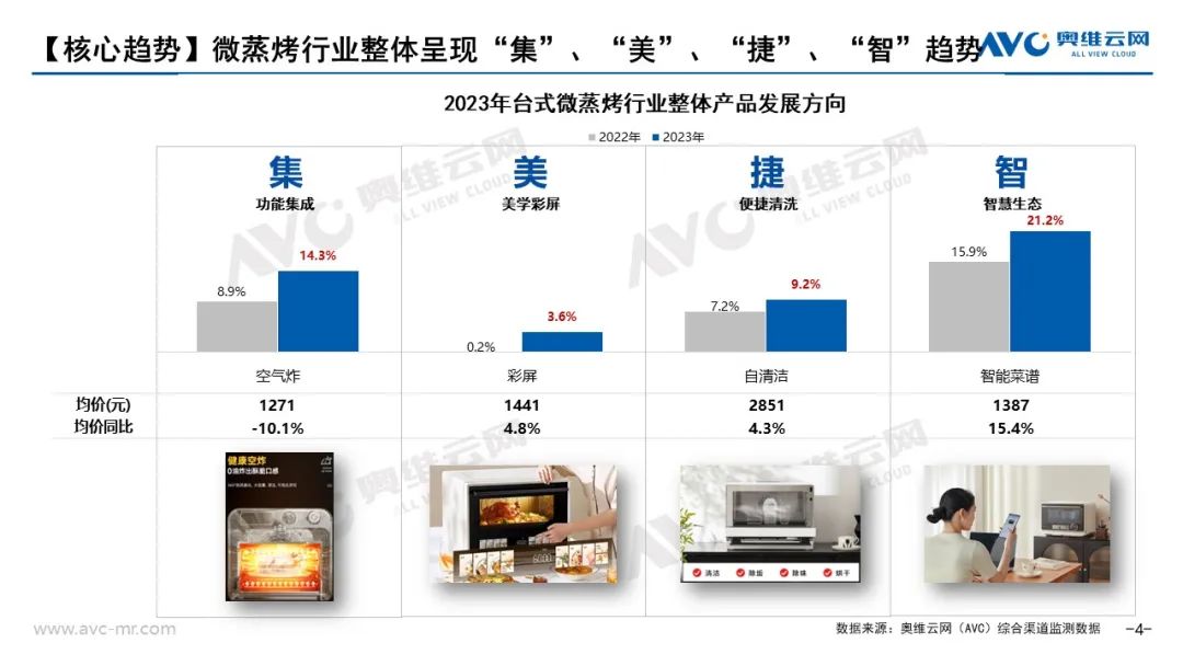 集:功能集成不止于微、蒸、烤復合,隨著空氣炸鍋概念普及,消費者對于空氣炸功能關(guān)注度越來越高,技術(shù)強相關(guān)也推動了臺式微蒸烤產(chǎn)品開始大規(guī)模升級空炸功能。據(jù)奧維云網(wǎng)(AVC)線上監(jiān)測數(shù)據(jù)顯示,2023年臺式單烤、臺式蒸烤、臺式微蒸烤品類中搭載空炸功能的產(chǎn)品銷額占比分別達到23.1%、57.2%、56.1%,均獲得較大增長。而行業(yè)并未止步于目前的功能集成,目前在臺式微蒸烤復合機產(chǎn)品中部分品牌開始布局微蒸烤炸燉產(chǎn)品,強化機型功能復合也為消費者解決了更為廣泛的場景需求。