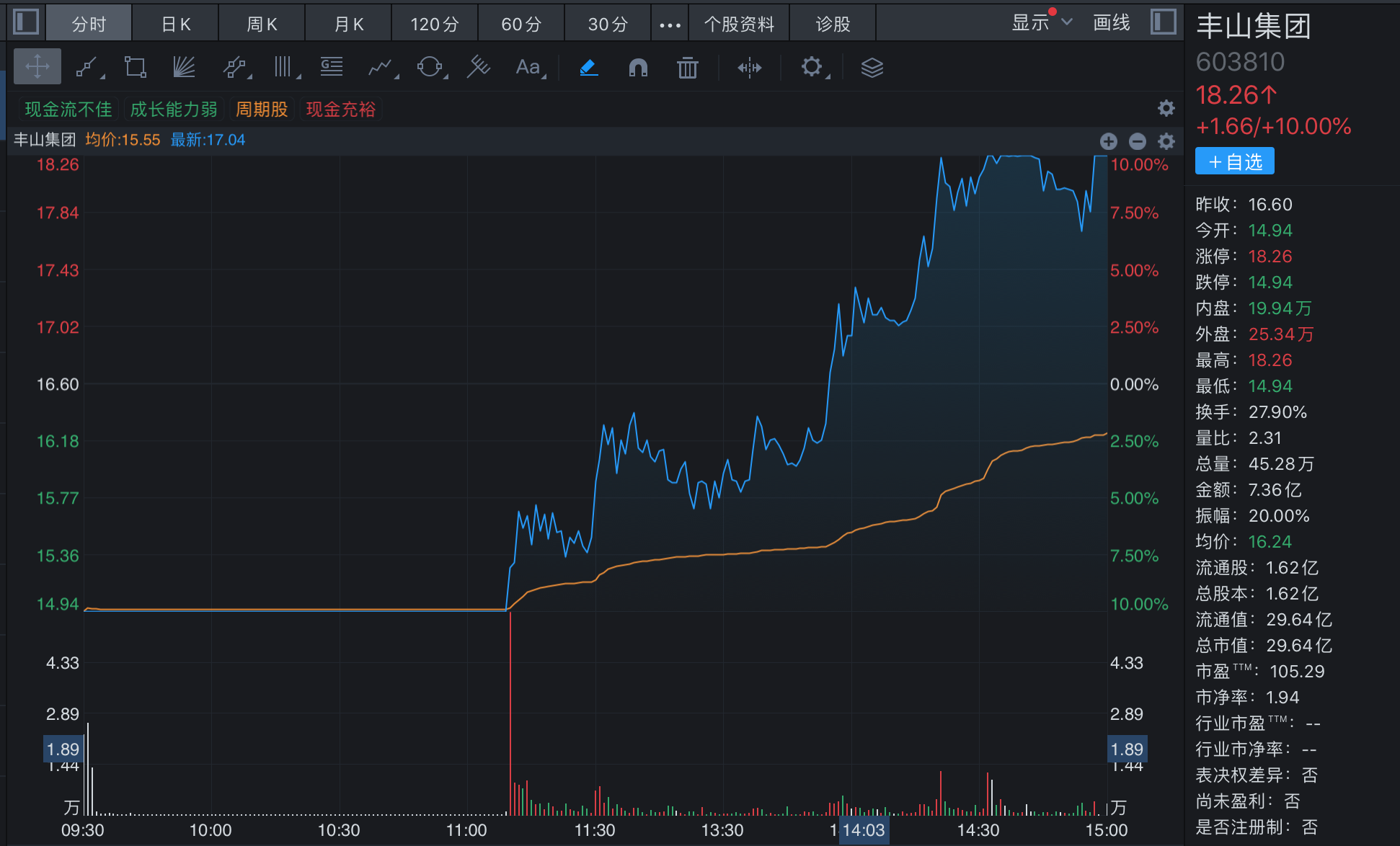 豐山集團股價也創(chuàng)出了這波上漲的新高18.26元。至此,該股已經(jīng)走出四天三板行情。