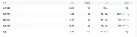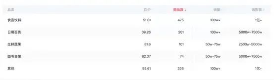 而董宇輝直播間的食品飲料、日用百貨、生鮮蔬果、圖書音像、其他的品類均價皆不到100元。