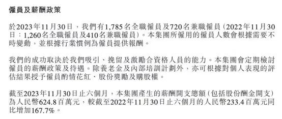 增收不增利的背后不僅有銷售及營銷開支的加大,東方甄選為了綁定員工而增加的股份酬金開支也在猛增。去年6月到11月,東方甄選的薪酬開支總額(包括股份酬金開支)大幅增長167.7%至6.25億元。