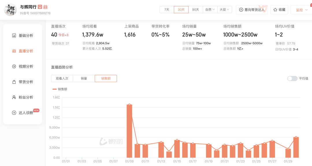 蟬媽媽的數(shù)據(jù)顯示,與輝同行單場(chǎng)直播GMV已經(jīng)從一開(kāi)始的1.6億元,逐步回落至四五千萬(wàn)元左右,而東方甄選單場(chǎng)GMV并沒(méi)有太大波動(dòng)。兩個(gè)直播間場(chǎng)觀人數(shù)、轉(zhuǎn)化率等較為接近。