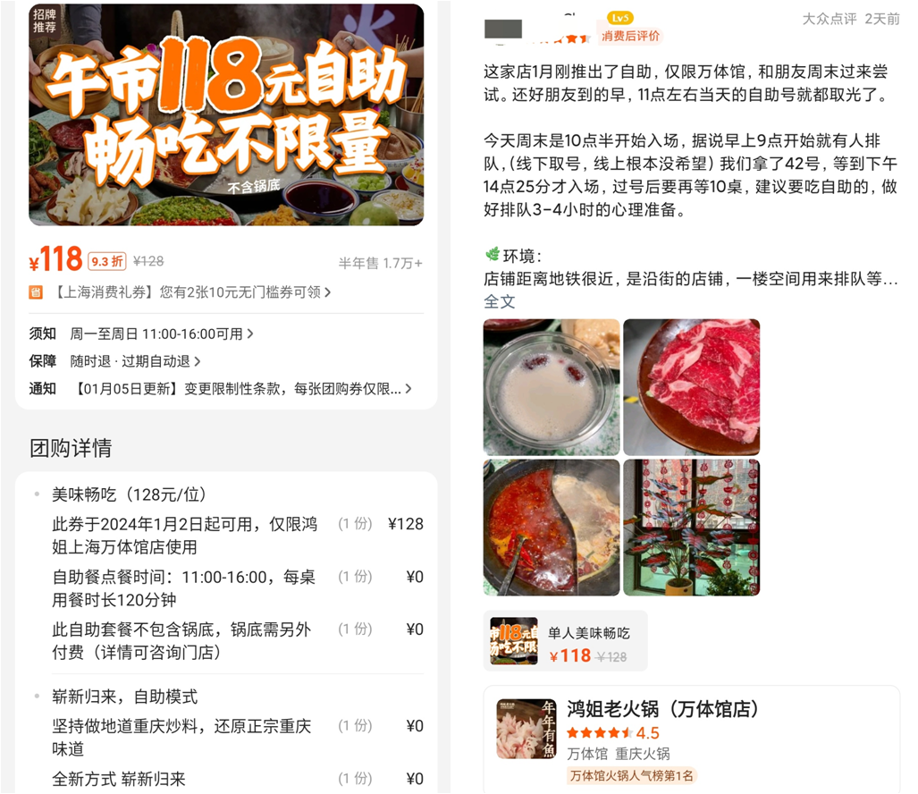 且不說海底撈出爾反爾是不是另有隱情,“午市自助”確實(shí)成為火鍋品牌翻紅的一大法寶。今年1月初,鴻姐老火鍋上海萬體館店上線單人118元午市自助餐,截至1月31日銷售超1.7萬件。此外,哥老官火鍋也傳出售賣自助午餐的消息。