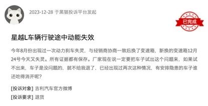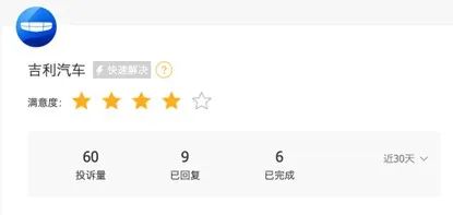 此外另有消費(fèi)者投訴稱“星越L車輛行駛途中動(dòng)能失效”,目前顯示為該投訴已完成,但消費(fèi)者對(duì)此的滿意度只有1星。