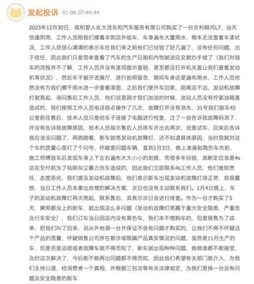 其中有消費(fèi)者2024年1月6日在平臺(tái)上投訴稱:2023年12月30日購(gòu)買的吉利銀河L7新提車,卻發(fā)現(xiàn)車身布滿劃痕,發(fā)動(dòng)機(jī)故障燈兩次亮起,被通知要換配件,消費(fèi)者希望賠償、退款、退貨。