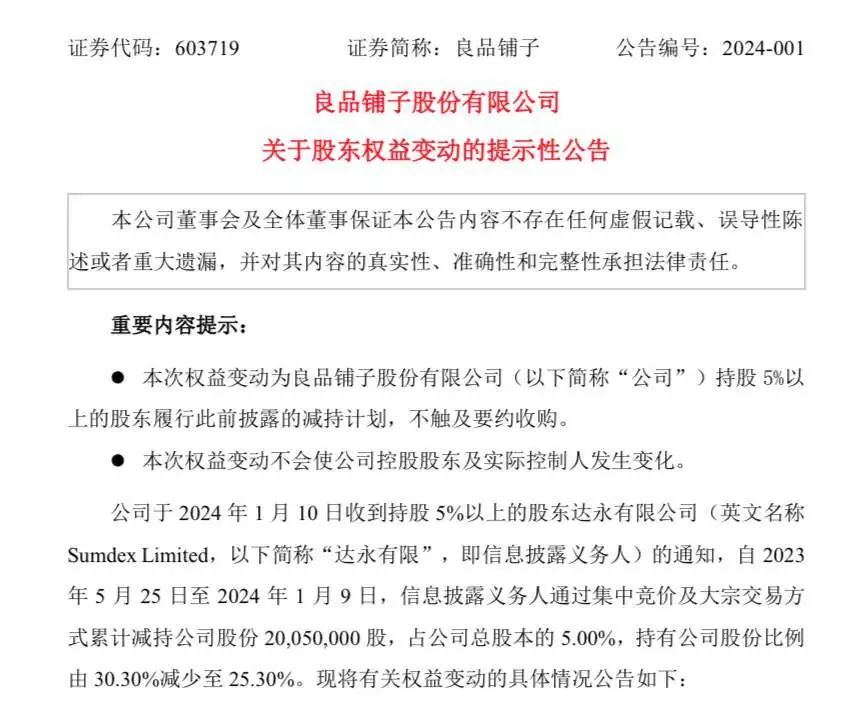 1月月中,良品鋪子發(fā)布公告,其中信息顯示第二大股東達永有限公司自2023年5月25日至2024年1月9日通過集中競價及大宗交易方式累計減持公司股份2005萬股,占公司總股本的5%,持有公司股份比例由30.30%減少至25.30%。
