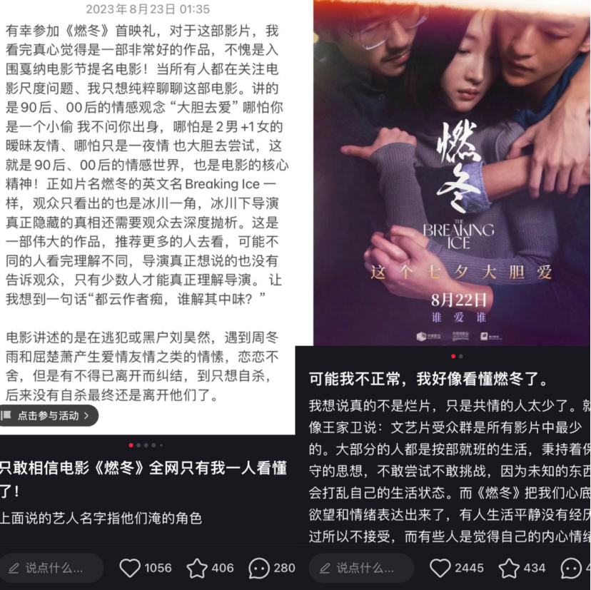 另外,電影宣發(fā)也沒有在第一時(shí)間根據(jù)輿情反饋調(diào)整策略。比如《燃冬》明顯在小紅書的口碑好于抖音,但在小紅書上,《燃冬》并未學(xué)習(xí)《宇宙探索編輯部》開通主創(chuàng)賬號(hào),也沒有太多投放,導(dǎo)致自然發(fā)酵的正面評(píng)價(jià)都無法轉(zhuǎn)化成票房和后續(xù)的口碑助力。