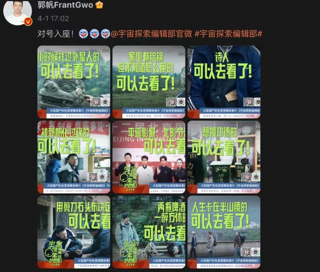 《宇宙探索編輯部》選在愚人節(jié)上映,沒有頭部演員加持,也不走“下沉”路線,始終貫穿“民科”主題,通過集中的預(yù)告片和物料輸出,將影片中的“軟科幻”和“荒誕浪漫”的元素以及偽紀(jì)錄片的形式傳達(dá)給觀眾。郭帆發(fā)布宣傳微博,也是在為這部電影找到精準(zhǔn)人群,有人因?yàn)橐痪洹叭松ㄔ诎肷窖?,可以去看了”,產(chǎn)生了觀影興趣。