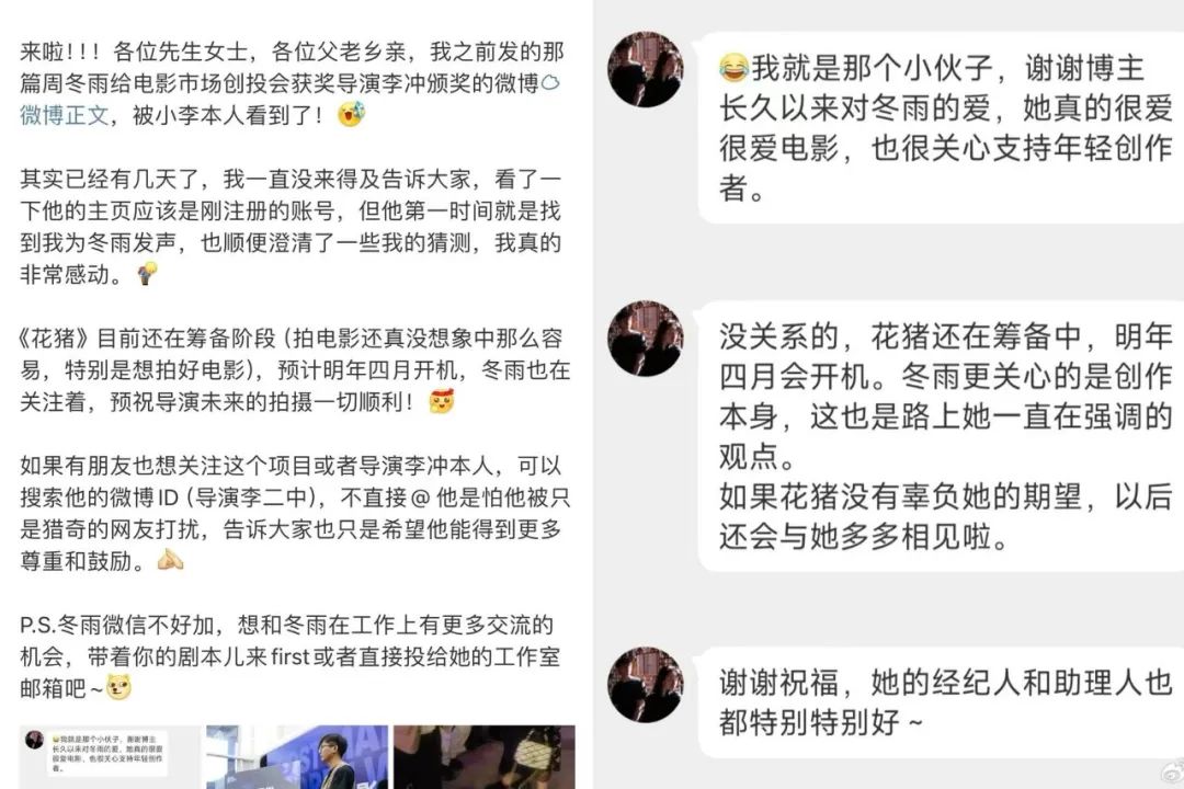 周冬雨曾在采訪中透露,自2022年4月《鸚鵡殺》殺青后,她沒進(jìn)過劇組,給自己放了個(gè)長(zhǎng)假,唯一要啟動(dòng)的項(xiàng)目是即將開機(jī)的《花豬》。這個(gè)劇本是她在擔(dān)任 FIRST 創(chuàng)投評(píng)委時(shí)發(fā)現(xiàn)的,由于非常喜愛這個(gè)故事,她很想幫助新人導(dǎo)演完成,“坦白講,我也不認(rèn)為它是一個(gè)能拿票房的片子,甚至上不上映我都沒考慮過,就是挺想幫他把這個(gè)故事拍出來?!薄痘ㄘi》的導(dǎo)演李沖也在微博上回應(yīng)網(wǎng)友:“冬雨更關(guān)心的是創(chuàng)作本身?!?/p>
