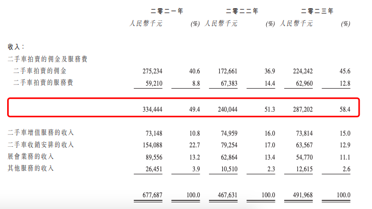 其中,二手車拍賣是汽車街主要的營收支柱,2021年、2022年、2023年營收為3.34億元、2.4億元、2.87億元,分別占總營收的比重為49.4%、51.3%、58.4%。