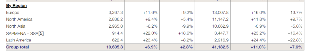 按地區(qū)情況來(lái)看,歐洲地區(qū)成為2023年集團(tuán)銷(xiāo)售額最高地區(qū),且保持了16.0%的高速增長(zhǎng)。北亞地區(qū)的表現(xiàn)不盡如人意,在其它四個(gè)地區(qū)均實(shí)現(xiàn)雙位數(shù)增長(zhǎng)的情況下,北亞地區(qū)卻同比下滑0.9%,總體銷(xiāo)售額低于歐洲及北美洲地區(qū)。拉丁美洲成為增速最為迅猛的地區(qū),高達(dá)22.8%。