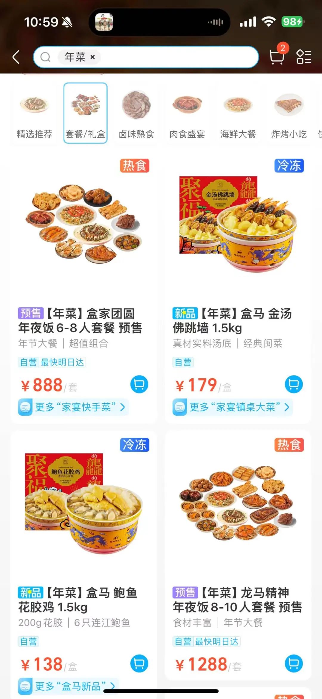 盒馬線上合作的預(yù)制菜品也相對(duì)較多,包括月盛齋的老北京羊蝎子、紅小廚的佛跳墻、同慶樓的臭鱖魚等八大菜系,品種較全。另外,還有一些知名酒店的半成品家宴套餐,比如新雅的全家福半成品家宴套餐禮盒,4.27kg售價(jià)488元;豐收日的6道半成品禮盒,1.98kg售價(jià)178元,均標(biāo)注為冷凍食品、24小時(shí)可以發(fā)貨。